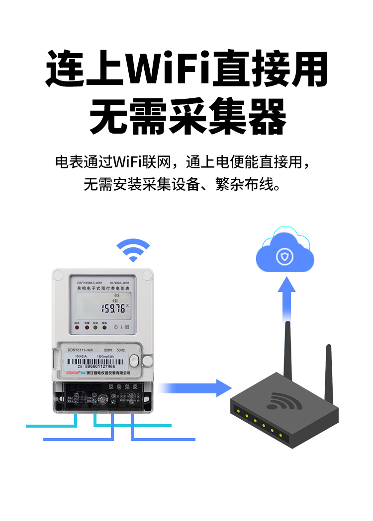 這種抄表方式在青年公寓,白領(lǐng)公寓,酒店式公寓采用比較多,這種方式直接聯(lián)上公寓里的wifi上遠(yuǎn)抄服務(wù)器,再通過電腦診斷或手機(jī)app就能直接使用,這種智能電表使用量不大的情況下,用戶可自行采購(gòu)安裝,WiFi電表安裝簡(jiǎn)單方便,圖如下: