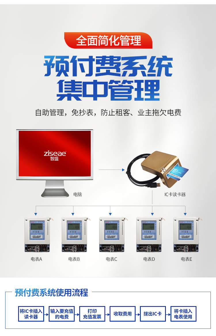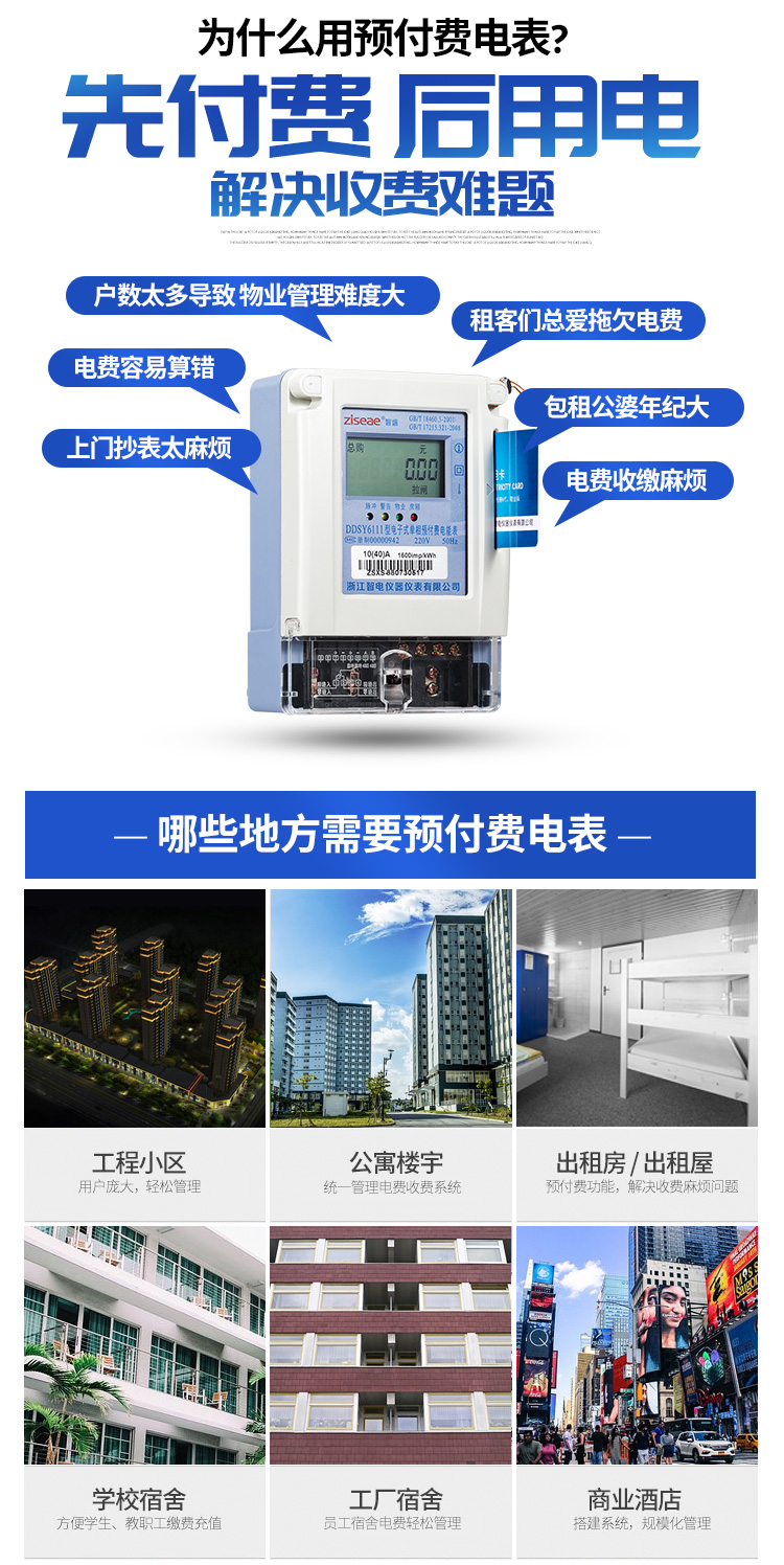 (4)預付費電度表適用的場所:工程小區用戶-龐大輕松管理,公寓樓宇-統一管理收費系統,出租房或出租屋-預付費功能解決收費麻煩問題,學校宿舍-方便學生教職工收費充值,工廠宿舍-員工宿舍電費管理,商業酒店-搭建系統規?;芾淼染唧w如下。