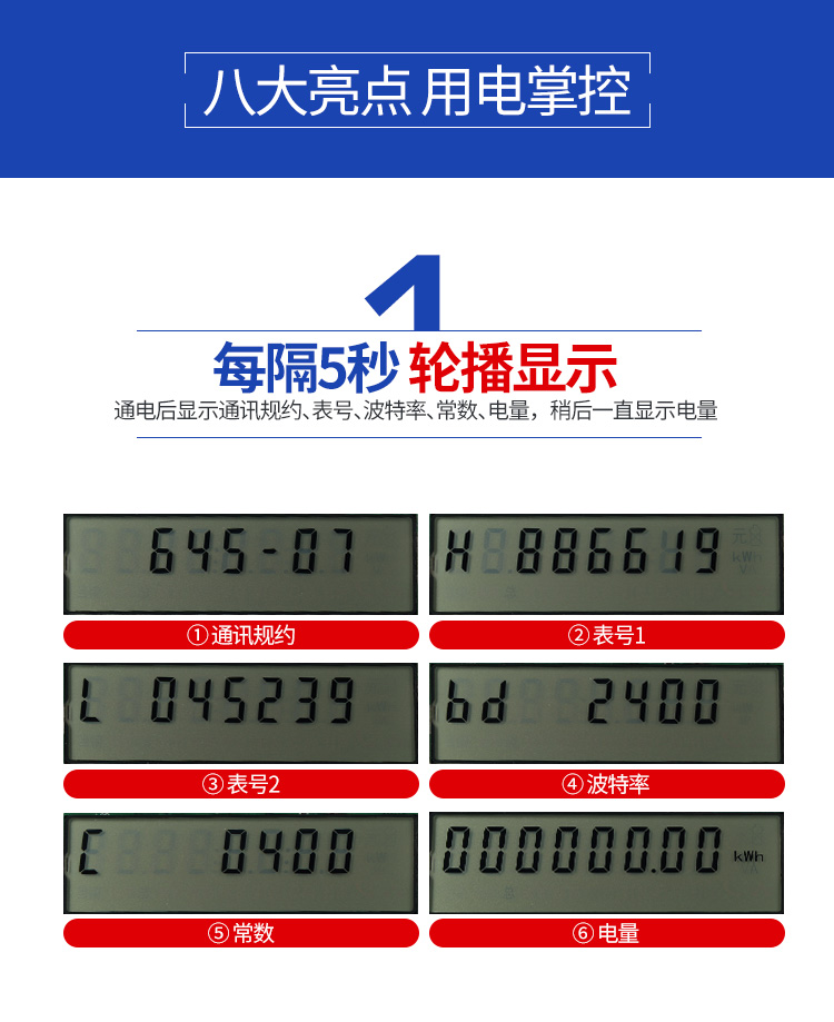 5.顯示功能 :采用寬溫大液晶方式顯示各類信息;電能量顯示位數(shù)為6為整數(shù),2為小數(shù),具有參數(shù)自動(dòng)輪顯功能。